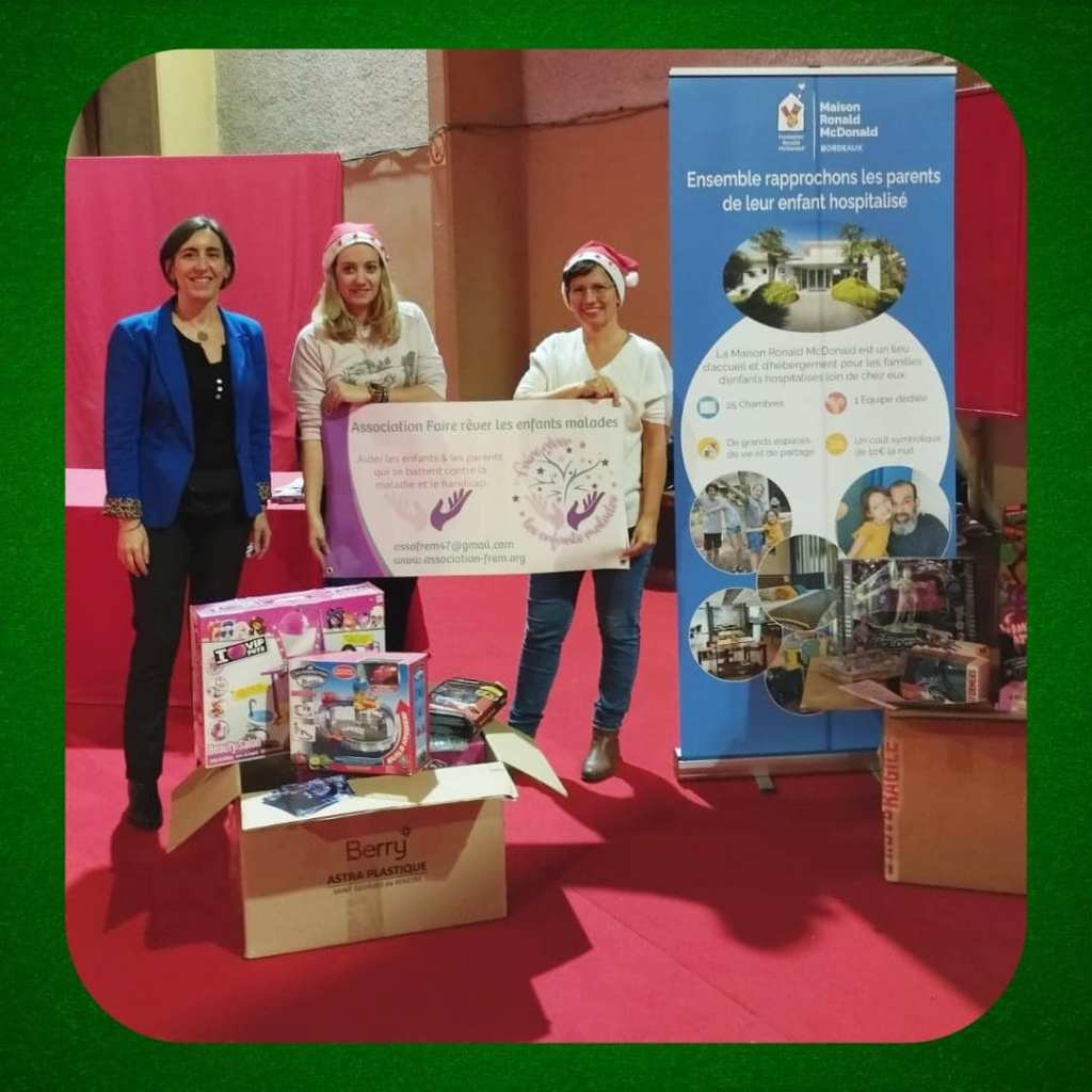 Chaque année du 1er au 30 novembre l’association récolte des jeux, jouets et livres pour ensuite en faire don aux hôpitaux, structures spécialisées mais également dans les maisons des parents type Macdo (ou autres) et dans les salles d’attente de professionnels de santé. Un établissement souhaitant bénéficier d’un don peut nous contacter par mail à: assofrem47@gmail.com